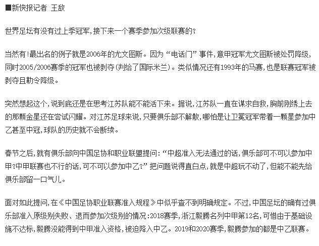 此外,拥有超过20年历史的天津泰达也放弃了挣扎,沧州雄狮和浙江绿城已经准备好递补回到中超。