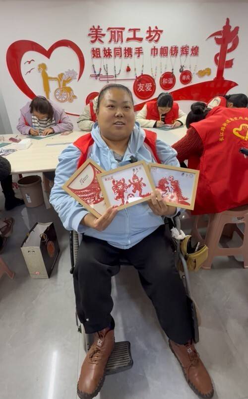 高玲玲自豪地告诉记者:“我2021年就来到了这个残疾人之家,最初做一些安装键盘等简单的手工活。2023年进入美丽工坊之后,我一下子就爱上了剪纸。老师们耐心地教导,我也用心学习,并没有觉得有多难。现在每天都过得非常充实,不再胡思乱想,更不会觉得生活没有希望了。”她还兴奋地展示了自己的作品,其中不少都曾亮相“淮马”和“苏超”等赛事活动。通过这份手工创作的收入,高玲玲攒钱购买了一辆残疾人三轮车,现在每天骑着它往返于家和残疾人之家,日子过得充实而充满希望。