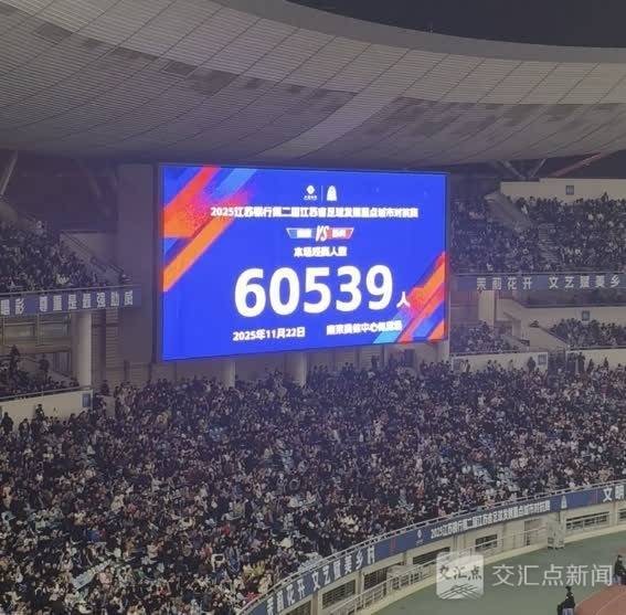 11月的南京夜晚已透着寒意,但南京奥体中心内的氛围却热烈如火——经现场统计,本场比赛上座人数达到60539人,延续了“苏超”联赛期间南京奥体场场破6万的火爆纪录。即便“苏超”落幕,江苏球迷的绿茵热情丝毫未减。